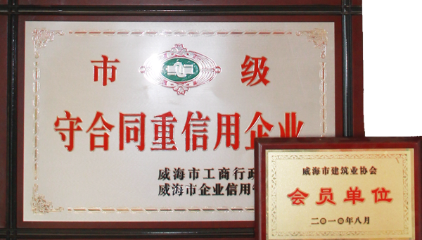 公司連續(xù)八年榮獲威海市“誠信開發(fā)企業(yè)”、“建筑施工誠信企業(yè)”,連續(xù)九年被評為威海市級“守合同重信用企業(yè)”,多次被評為威海市“市級文明單位”、“質(zhì)量管理先進企業(yè)”、 “安全管理先進企業(yè)”,乳山市“優(yōu)秀企業(yè)”、“先進民營企業(yè)”、“納稅明星企業(yè)”,在社會上逐步樹立了誠信、穩(wěn)健的企業(yè)形象。